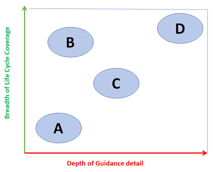 In your organization it was decided to use Safe®. Where does this agile approach stand on the chart below in terms of depth of guidance and breadth of life cycle coverage compared to other agile approaches? (On the real PMP exam you may be asked to provide your answer by clicking the correct area in the image. But here, you are asked to select the answer below.)