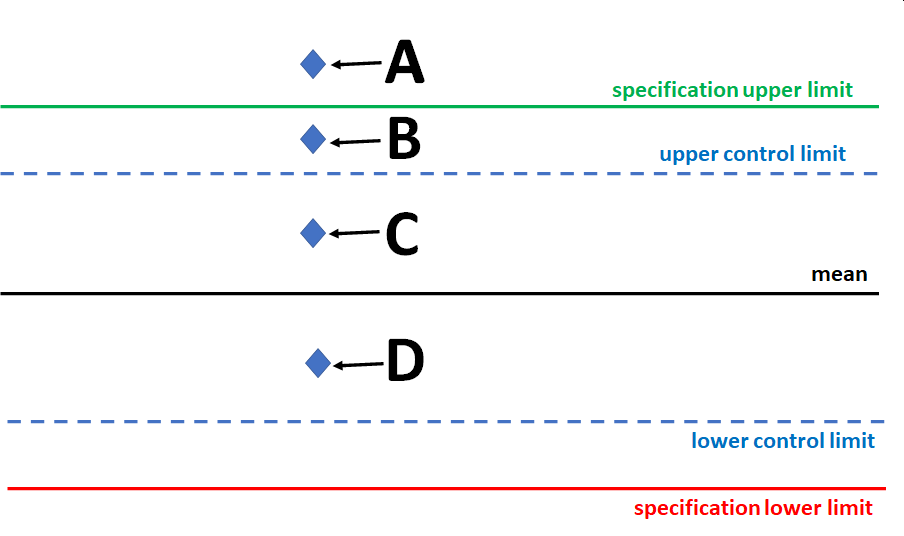 Your team has produced a deliverable. Following the analysis, the deliverable was accepted by the customer but you as a performing organization have a problem because the process did not work as you designed it. Where is that most likely to be located in the control chart? (On the real PMP exam you may be asked to provide your answer by clicking the correct area in the image. But here, you are asked to select the answer below.)