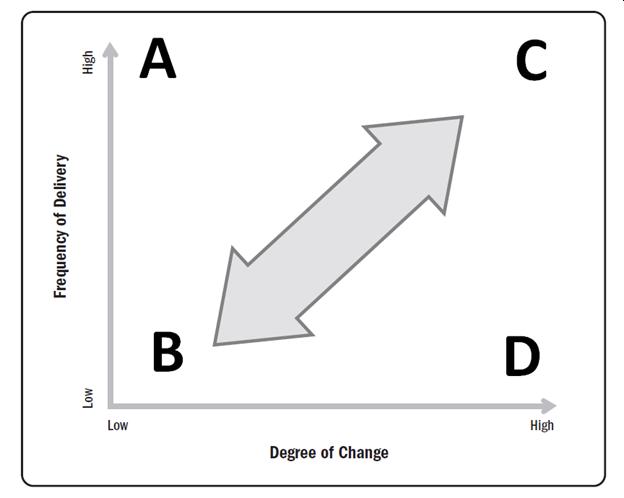 A project team is using The Continuum of Life Cycles model to evaluate the degree of change in the project the frequency of delivery required in order to select the appropriate project life cycle. The team maps the degree of change on the horizontal axis and frequency of delivery on the vertical axis. The resulting mapping suggests that an incremental life cycle would work best for this project. Where on the Continuum of Life Cycles model did the team most likely map the project?