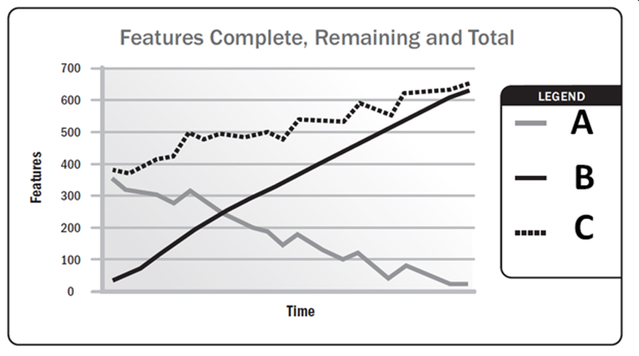 You receive the table below but it seems that the team forgot to add the legend. Which of the lines from the table is representing how the project’s total features changed over time? (A, B or C)
