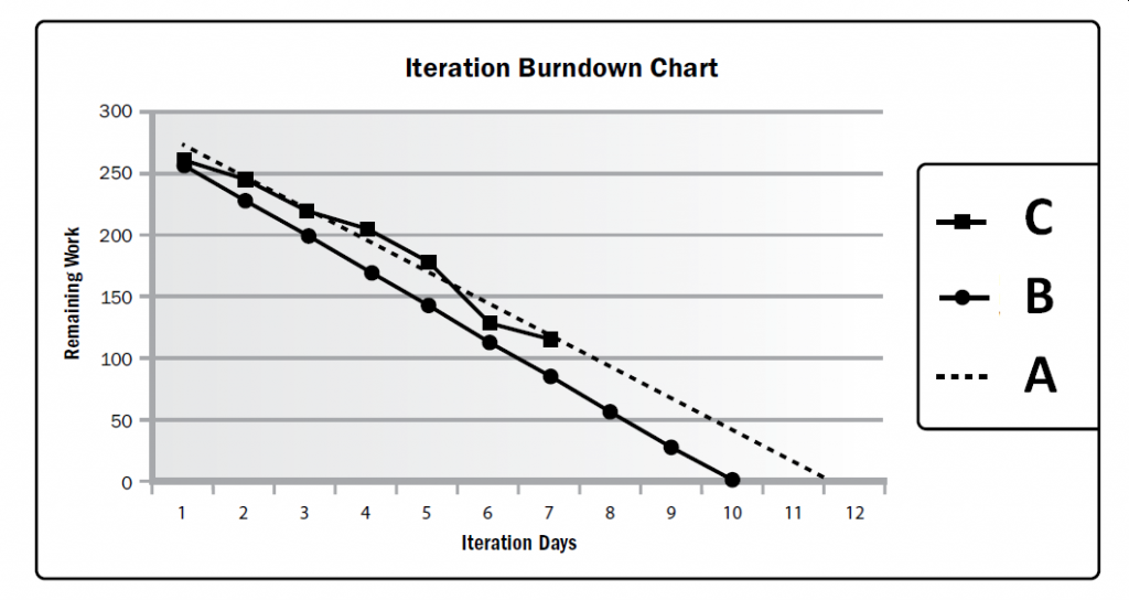 You are using an iteration burndown chart to track the work that remains to be completed in the iteration backlog. Which of the following lines represents the forecast of the remaining work? (On the real PMP exam you may be asked to provide your answer by clicking the correct area in the image. But here, you are asked to select the answer below.)