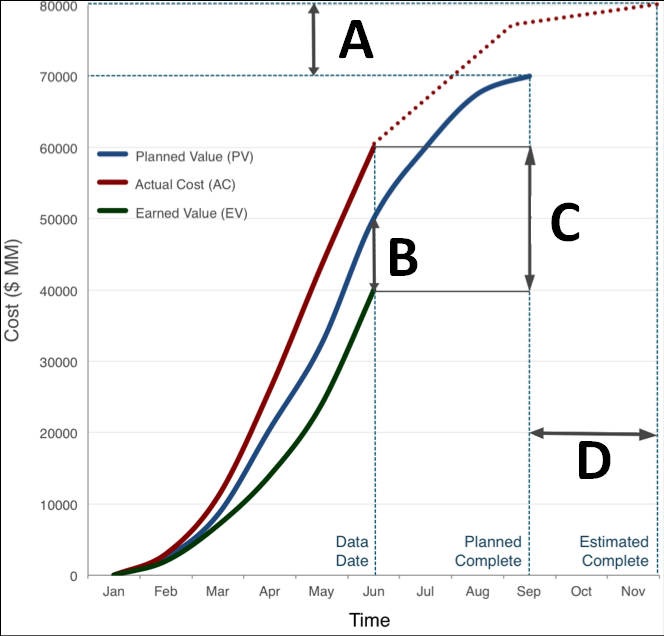 Which from the table is a projection of the amount of budget deficit (A, B, C or D)? (On the real PMP exam you may be asked to provide your answer by clicking the correct area in the image. But here, you are asked to select the answer below.)