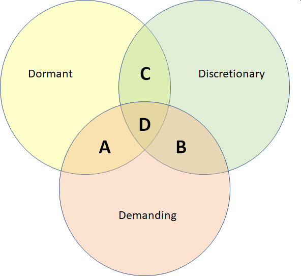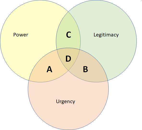 You classified the stakeholders according to 3 attributes: power, legitimacy and urgency. You have a stakeholder that you classify as dangerous. Based on the salience model, where would you place that stakeholder? (On the real PMP exam you may be asked to provide your answer by clicking the correct area in the image. But here, you are asked to select the answer below.)