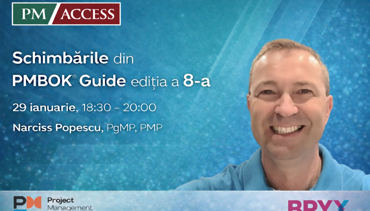 Certificare PMP / PDU-uri / Webinarii inregistrate “Schimbarile din PMBOK Guide editia a 8-a” cu Narciss Popescu by BRYXFebruary 2, 20260 ShareTweetPin ItShare Reading Time: < 1 minute Cei care detin o certificare PMI, dupa ce il urmaresc, pot raporta 2 PDU-uri. PDU Claim Code: 4362USHX8S Schimbarile din PMBOK Guide editia a 8-aWatch this video on YouTube ShareTweetPin ItShare